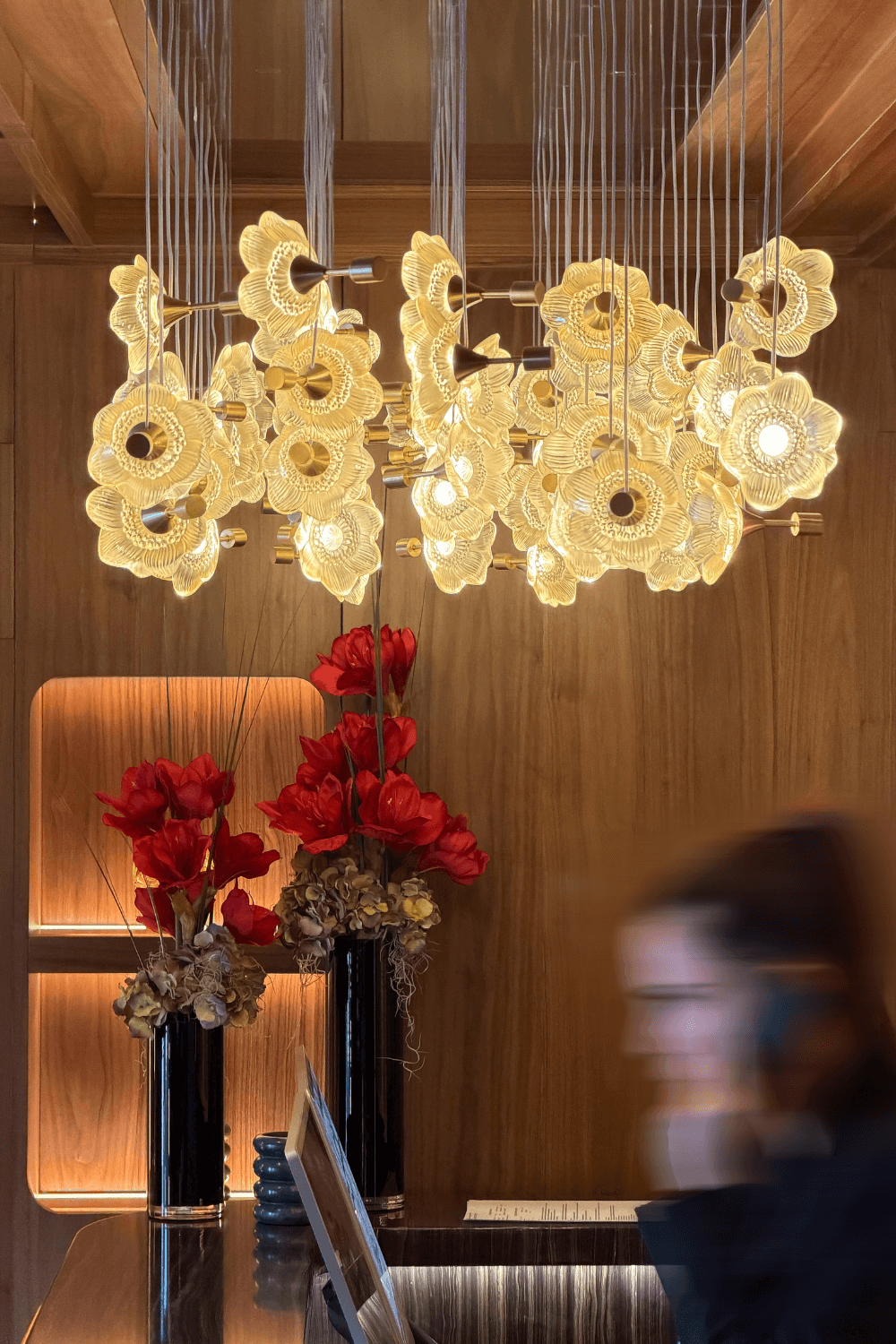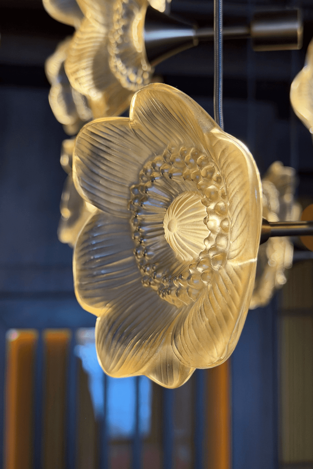 La signature artistique de Lalique se dévoile dès le lobby. Le regard est immédiatement attiré par un lustre composé de soixante anémones en cristal lustré d’or. Suspendues dans un équilibre subtil, ces fleurs forment un bouquet aérien et lumineux qui incarne l’univers poétique du Maya Hotel Courchevel 1850.