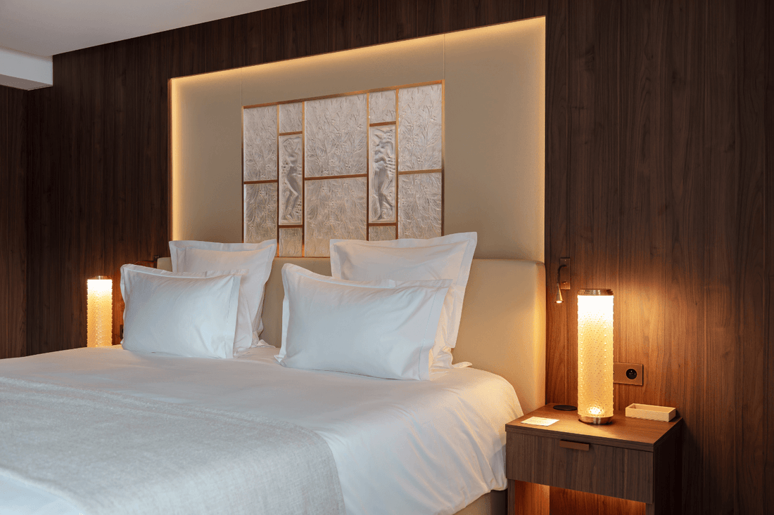 Imaginé par l’architecte d’intérieur Sylvestre Murigneux, ce boutique-hôtel se déploie tel un havre de paix. Les lignes sobres et les matériaux organiques – bois, pierre, bronze – composent une atmosphère apaisante, évoquant à la fois la force de la nature et la délicatesse de l’artisanat. Chaque espace a été pensé pour offrir confort et sérénité dans une esthétique intemporelle qui revisite les paysages de montagne.