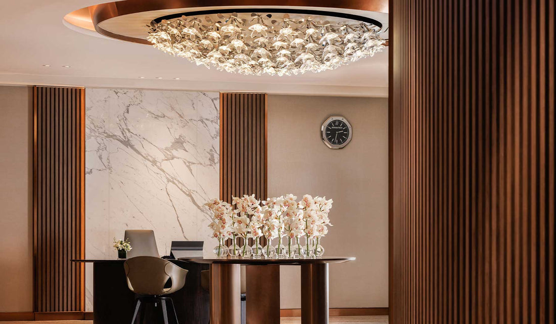 The Lalique light dome, which adorns the lobby of the Private Room, which offers Singapore Airlines (SIA) Suites and First Class customers a private and sophisticated space to rest and relax, comprises more than 107 crystal flowers inspired by Aquatic Ginger, one of the 10 native flowers in SIA’s batik motif. They are designed by Marc Larminaux, Lalique’s Artistic and Creative Director, working closely with Adeline Lunati, Head of the Lalique Interior Design Studio. Created to appear as if it is ‘a crystal bouquet floating in the sky’ the complex suspended installation is set against a dense foliage of polished metal leaves to further enhance the brightness of the flowers. Each light embedded into the satin polished crystal flower diffuses and evolves in terms of intensity and colour according to the time of day.