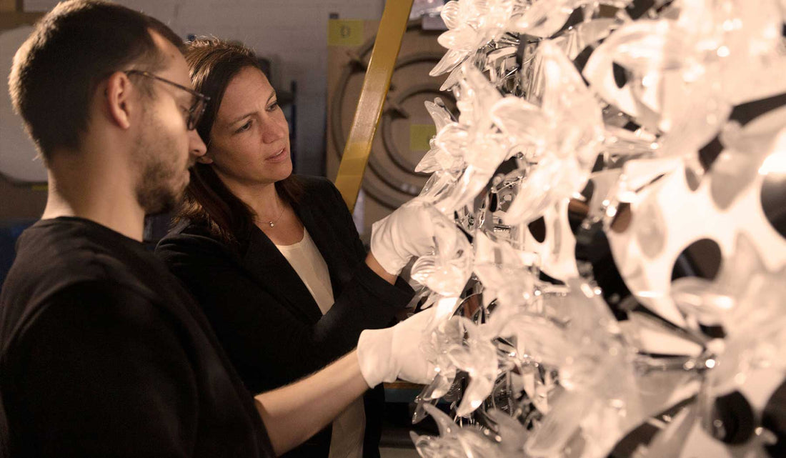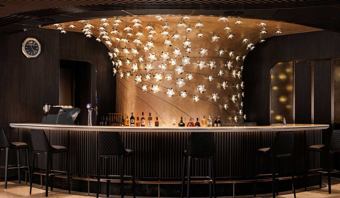 For the bar area in the First Class section of the SilverKris Lounge, Lalique has created a crystal wall installation using 119 crystal aquatic ginger crystal flowers – each one was positioned manually on the wall to sympathetically follow the curved shape of the space. With leaves that are folded by hand one by one, each flower was carefully installed with metal strips to naturally guide and form a stem that appears to spread on the wall. When lit, the wall blossoms into a welcoming and elegant crystal light using embedded fibre optics.