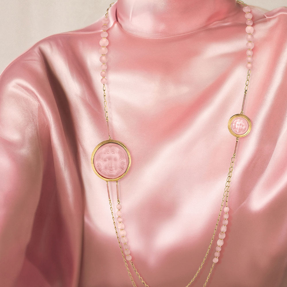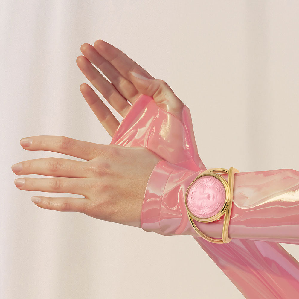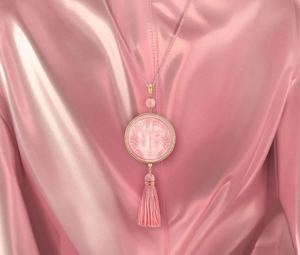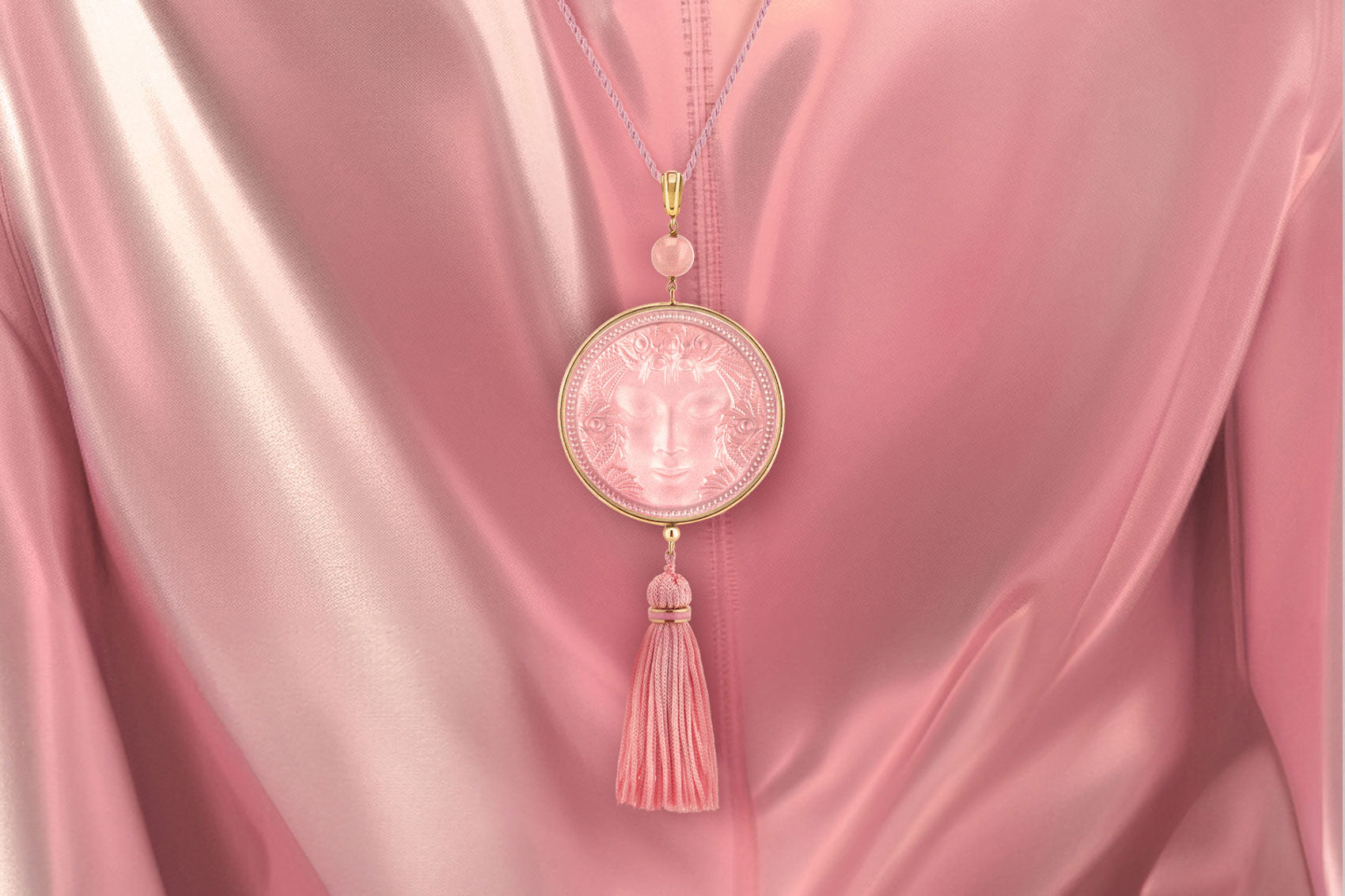 Created by René Lalique in 1935, the ‘Masque de Femme’ motif reveals the face of a mysterious woman, Arethusa, surrounded by aquatic fauna. Lalique continues the bold and avant-garde vision of its founder by creating a new rounded Rose Nebula pearly design, which softens the original aesthetic and gives it a futuristic and singular character.