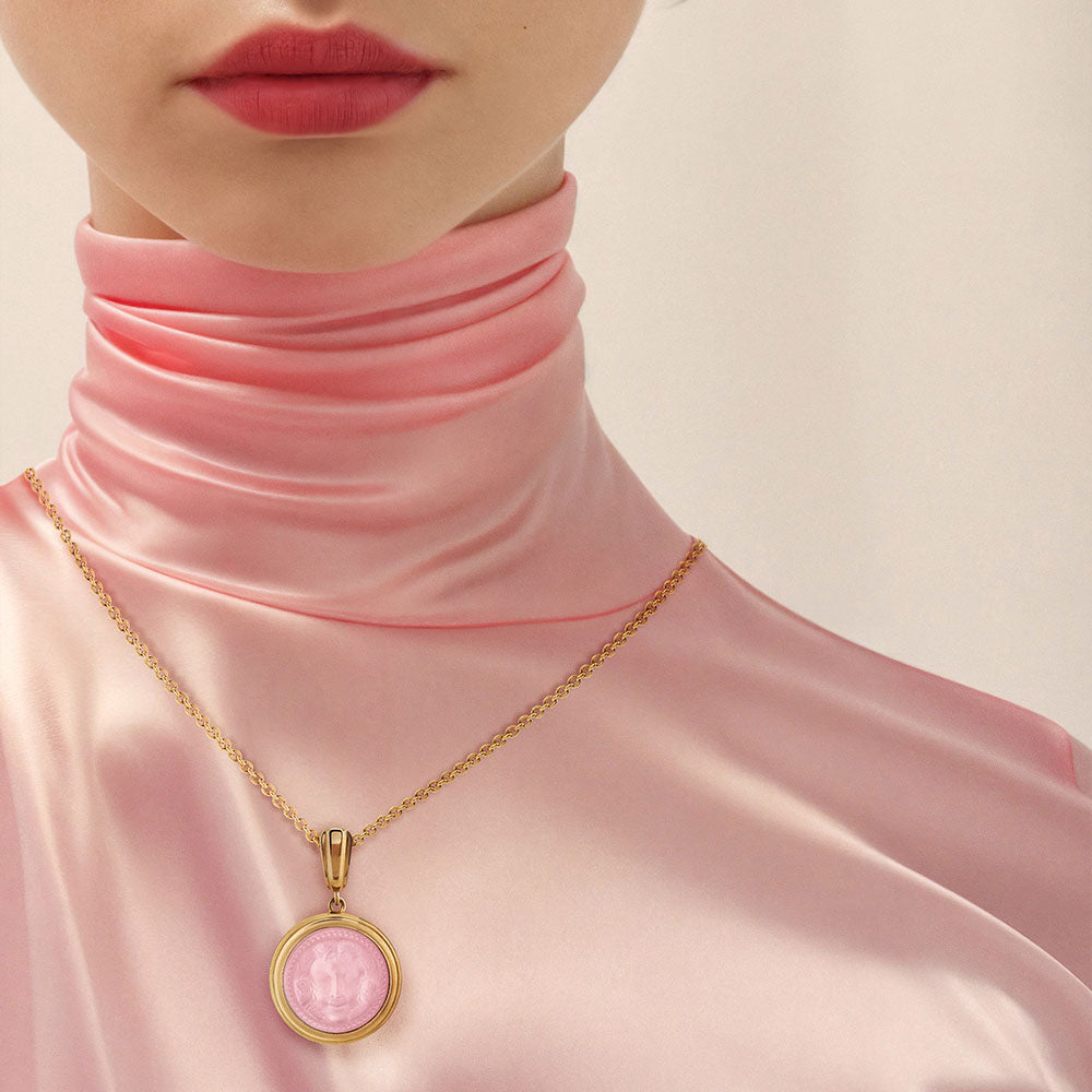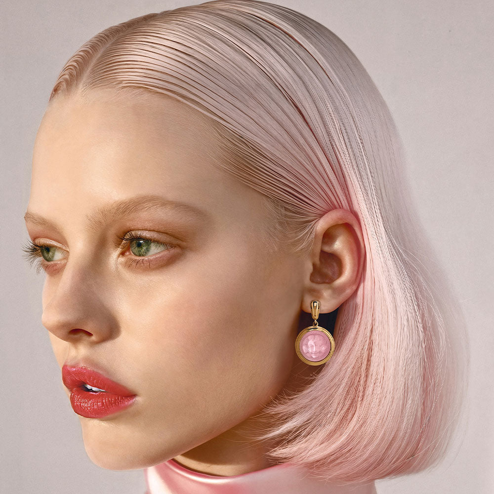 An absolute icon in square form, the Aréthuse crystal is reinvented in a pink lustered crystal medallion. In a neoclassical style, the simple, pure lines of the 18-carat yellow gold-plated frames enhances the rose-pearled crystals to embody a new modernity.