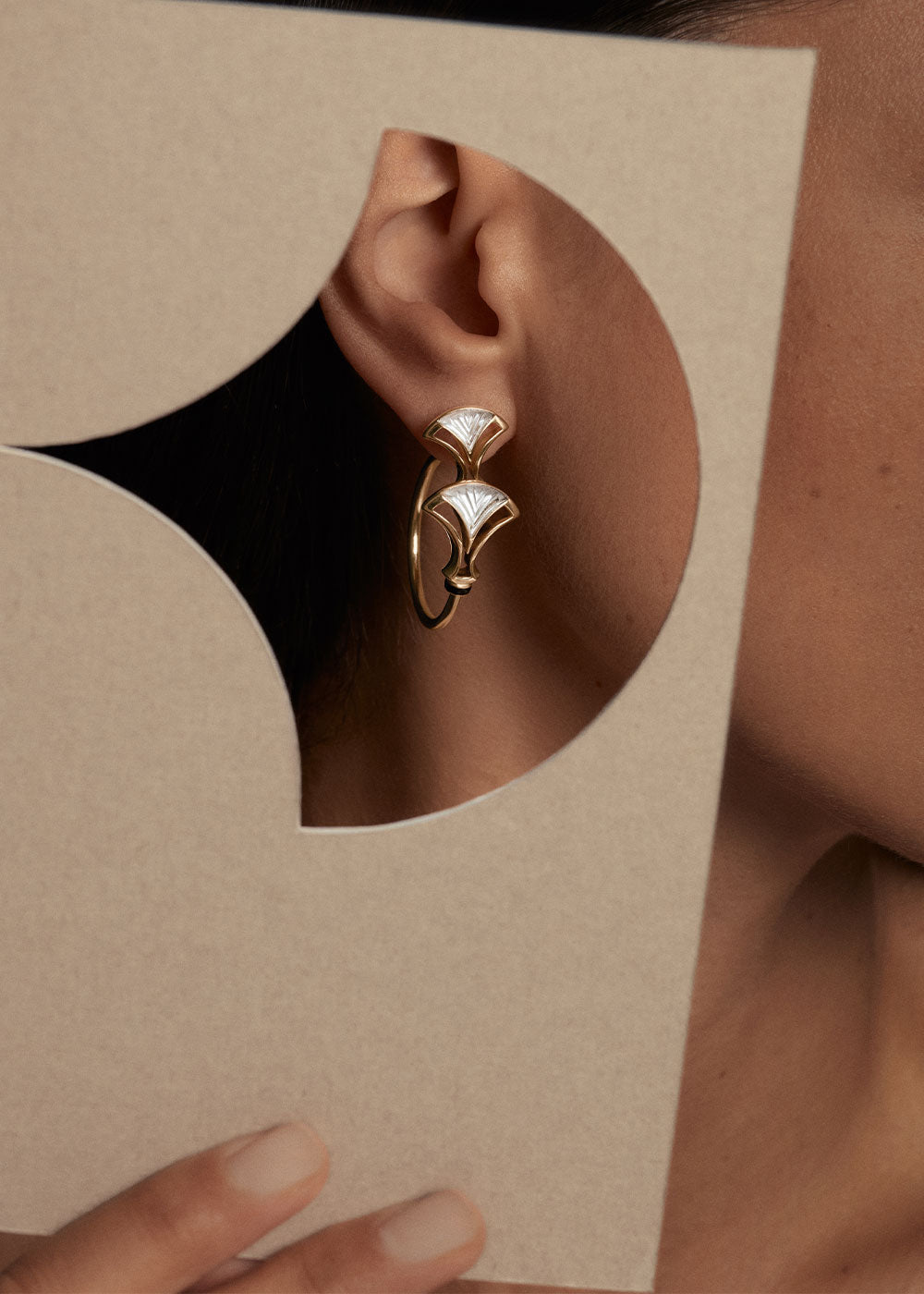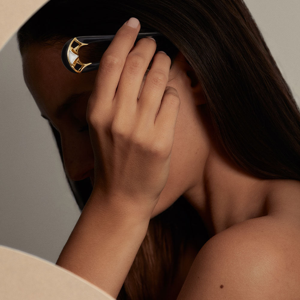 Subtly sculpted lines radiate on the crystal of this jewellery collection. The geometric silhouette of the openwork frame is inspired by the decorative structures of the Art Deco period, with arches combining metal and glass. A thin line of black lacquer comes to complete the aesthetic of the collection.