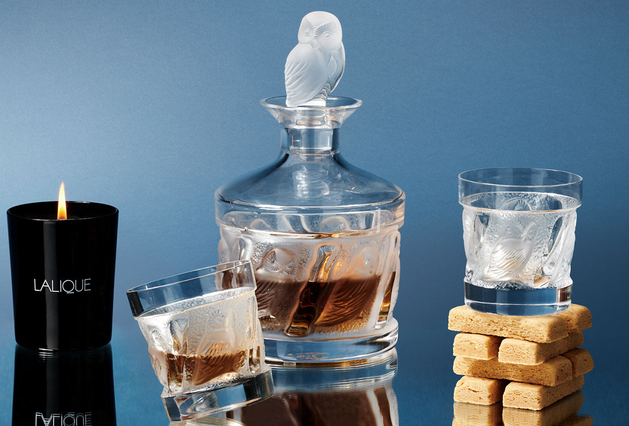 In 1994, the Owl, a mythical bird symbolising wisdom, inspired Lalique to create two tumblers featuring strong, structured lines. In 1995, a decanter is added to the range, with a very original shape and crystal owl stopper.
