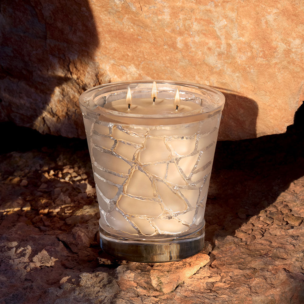 A scented wax candle, blending woody and mineral notes, exalted by a majestic crystal vase.
