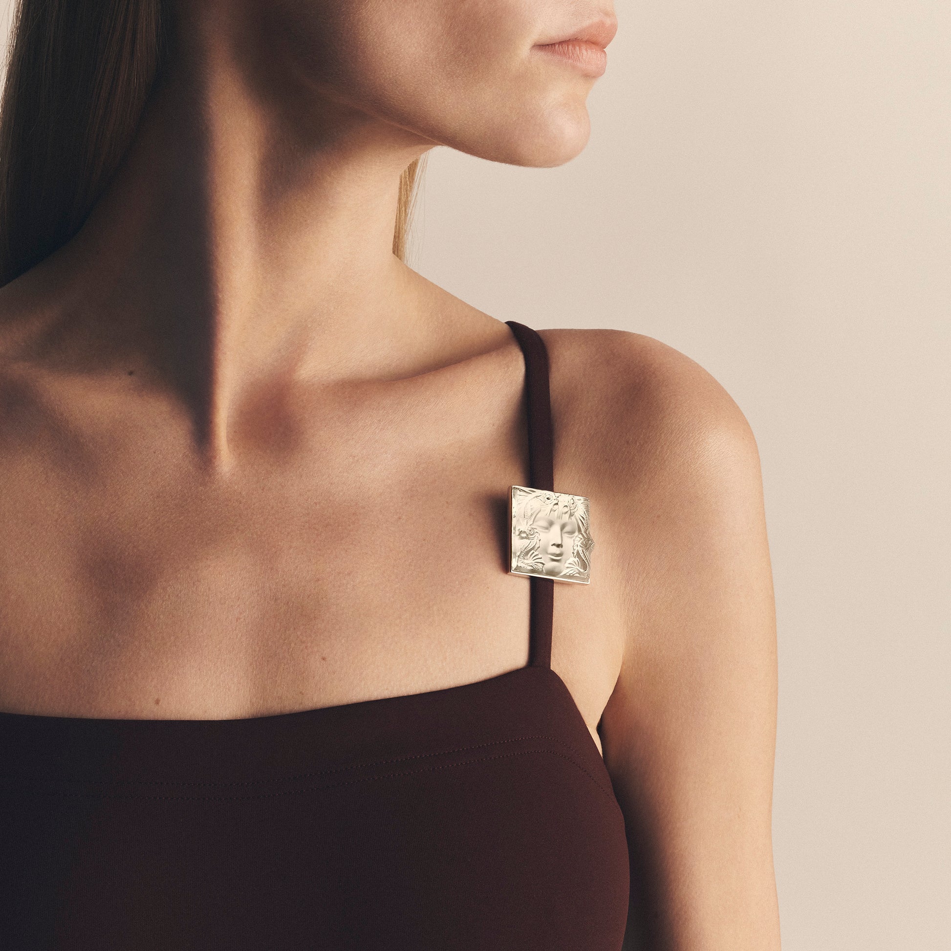 The famous "Masque de Femme" motif reveals the face of a mysterious, elegant woman wearing a headdress of aquatic life, symbolizing the nymph Arethusa.