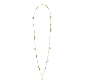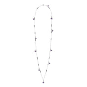 The crystals, subtly sculpted with striations, droped on the chain of this long necklace, alternated with delicate pearls. The geometric silhouette of the openwork frame is inspired by the decorative structures of the period, with arches combining metal and glass. Timeless clear crystal set in luminous gold, or silver with dusk purple crystal, are adorned with a thin black lacquer inspired by Art Deco.
