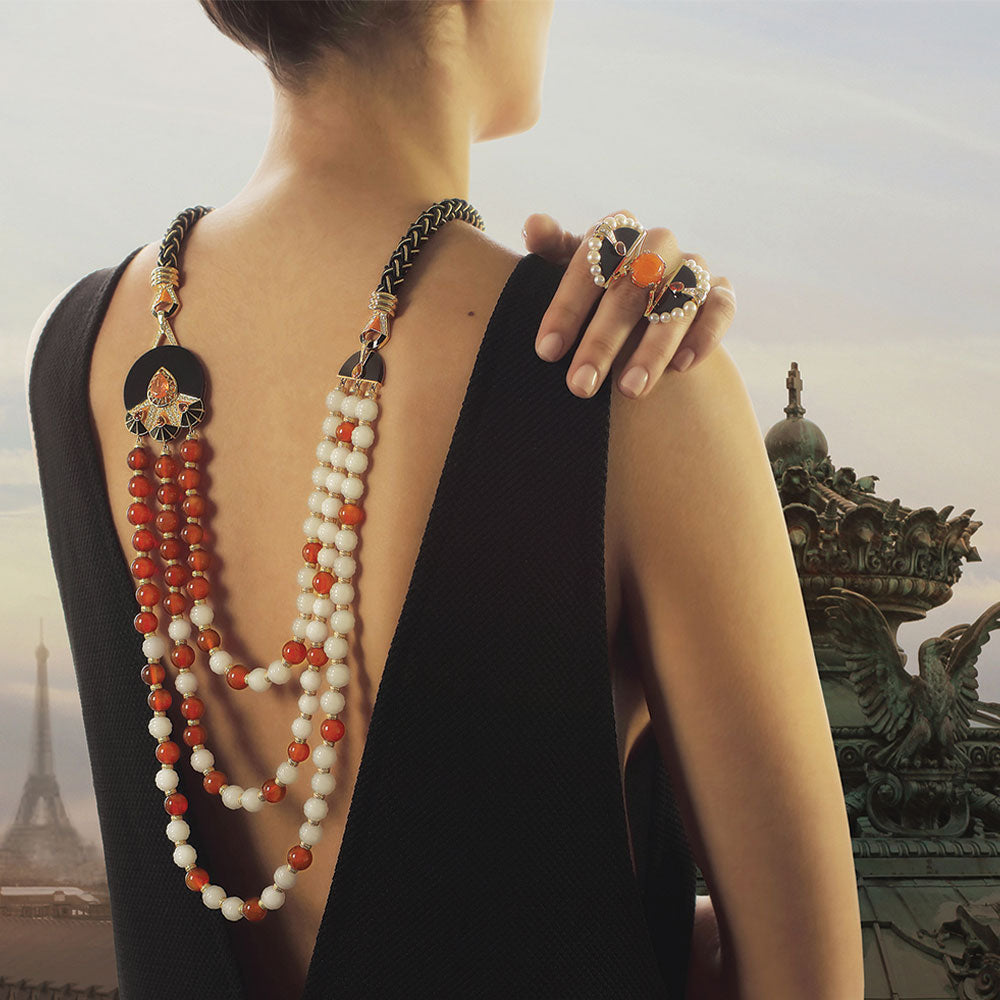 YELLOW GOLD, SAPPHIRES, DIAMONDS, FIRE OPALS, JADE, CARNELIAN, LACQUER