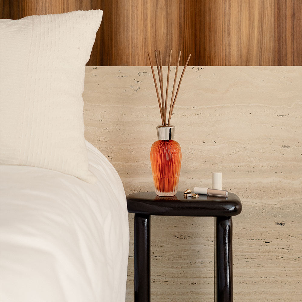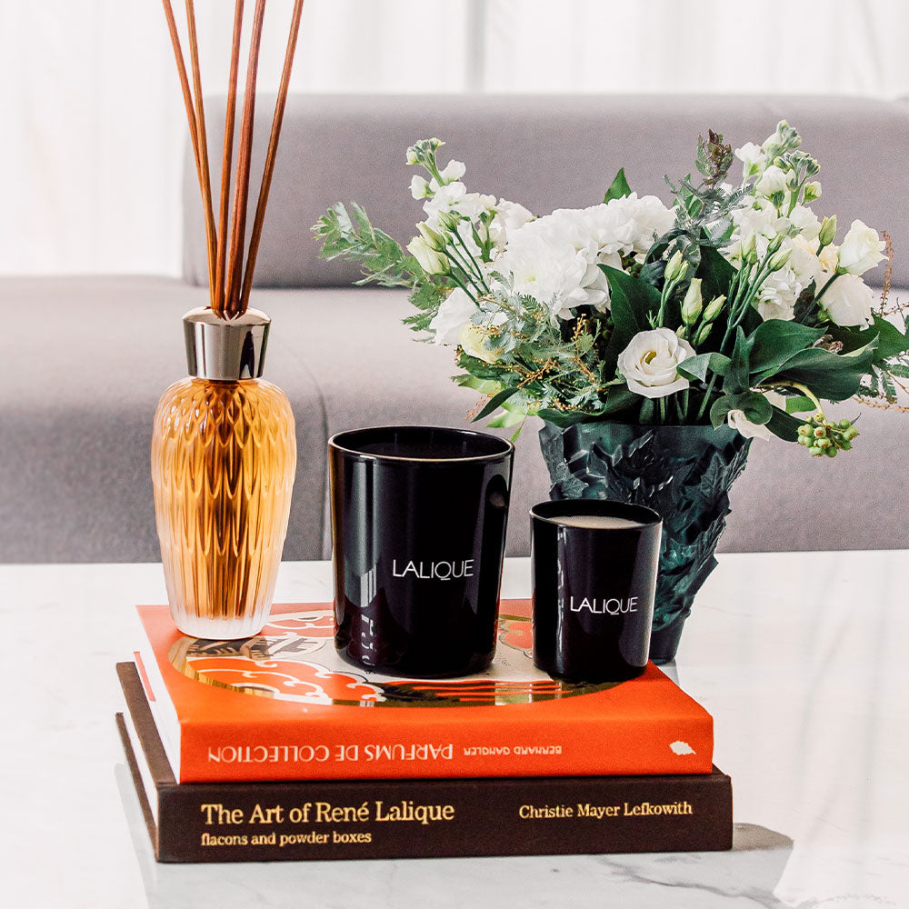 An exceptional diffuser, the very essence of Lalique’s refined expertise. The frosted crystal bottle creates a stylish soft feather motif, inspired by the ‘small leaves’ motif created by René Lalique in 1910. Adorned with a gleaming bottle neck, the diffuser holds sticks that plunge into a fragrant liquid, absorbing the scent and diffusing a powerful glimpse of another time and place. An olfactory voyage to be chosen from three high perfumery creations, depending on your mood.