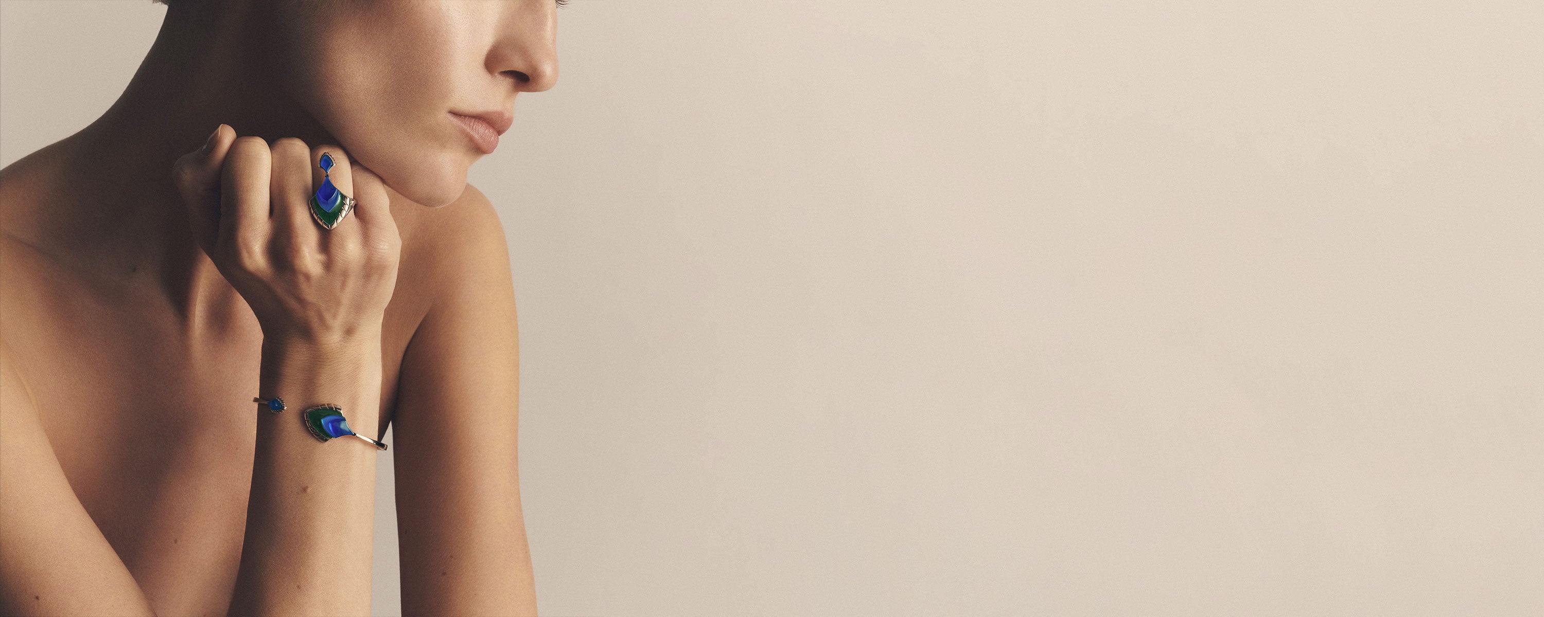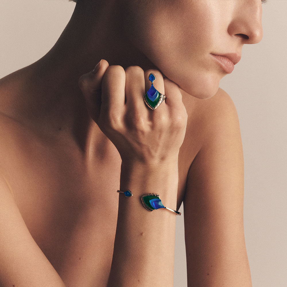 Ces bijoux hypnotiques livrent une interprétation graphique et stylisée des plumes irisées du paon. Le cristal bleu intense parfois rehaussé de laque verte sur argent interprète son plumage, tandis que le cristal incolore nacré sur or plaqué 18 carats imite le rare paon blanc.