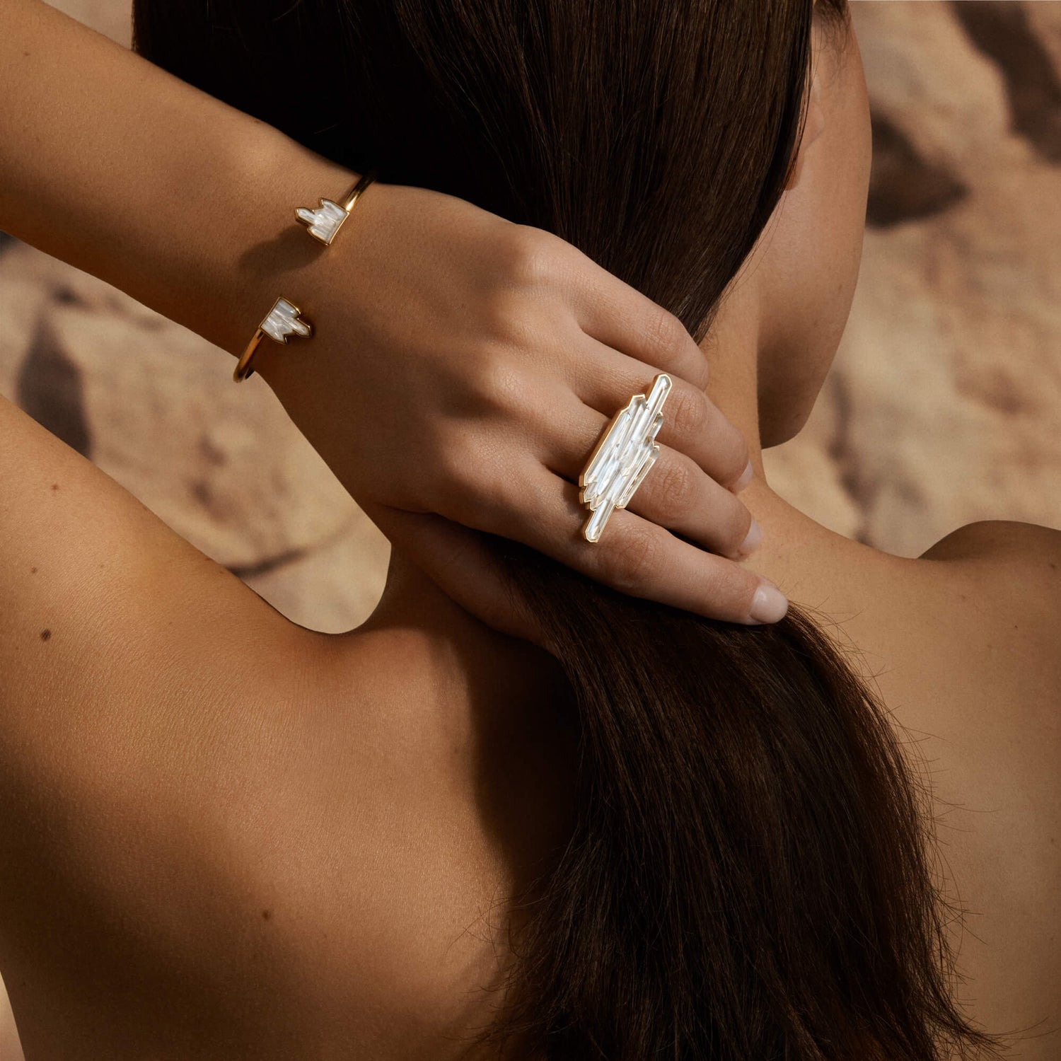 Les minéraux naturels sont fascinants par leur beauté et leur diversité. Formés au cours de millions d'années, ces trésors de la terre ont des formes, des couleurs et des structures uniques. La collection Terramineral bijoux, véritable prouesse de fabrication, met en scène trois tailles de cristaux finement sculptés et ciselés pour former des motifs aussi variés qu’élégants. Tel un serti clos la fine monture épouse parfaitement le contour du cristal.