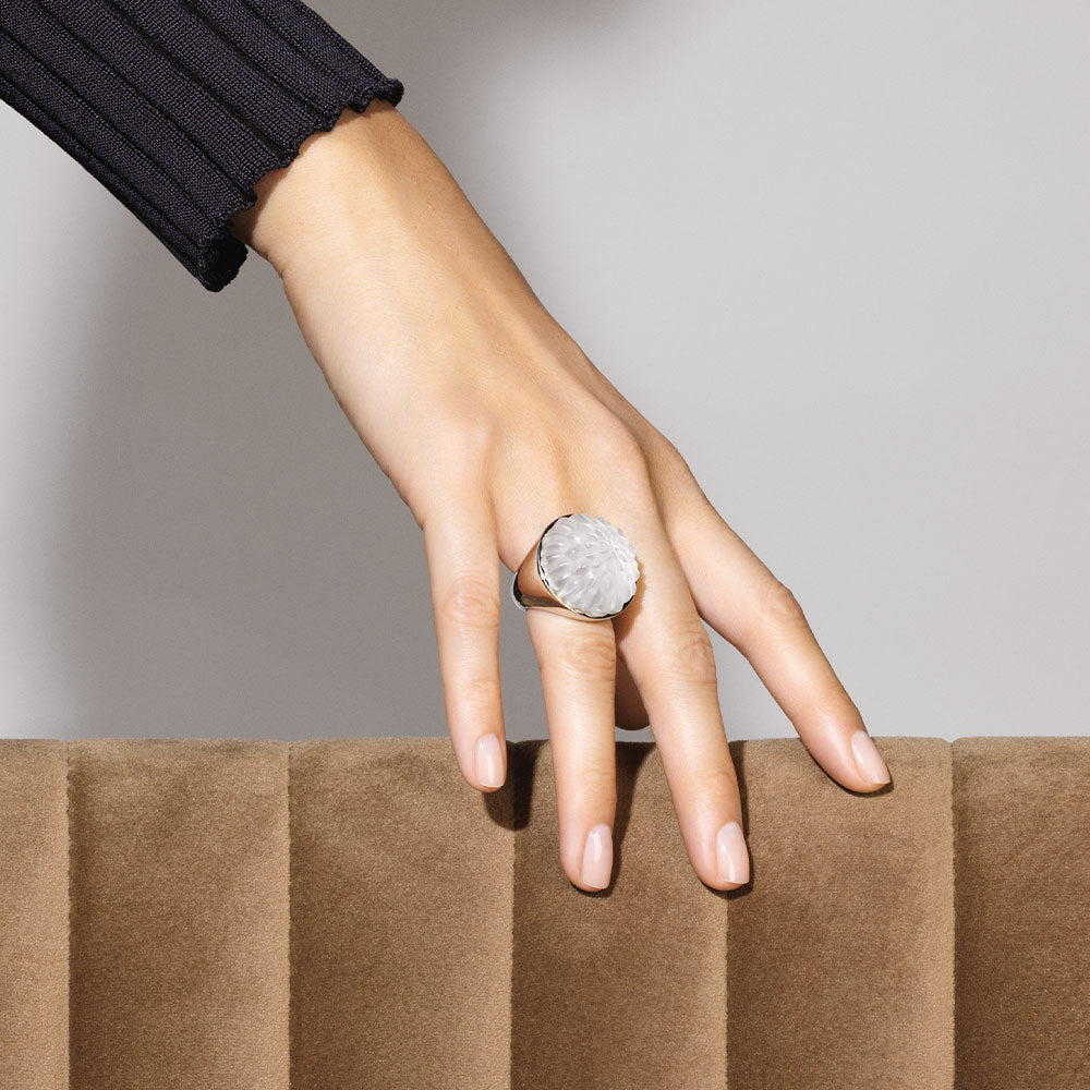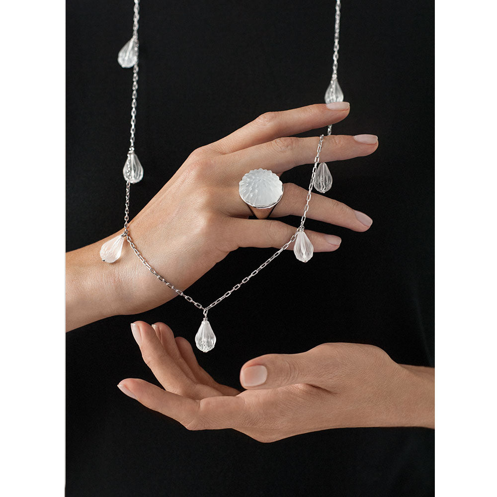 Interprétant le bouton de fleur prêt à éclore ce tourbillon de pétales se dessine dans un style graphique évoquant l’héritage Art Déco de la Maison. Une création déclinée dans une version XXL accessoire ou dans une version pampille, multipliées sur un sautoir ou à porter en motif unique.