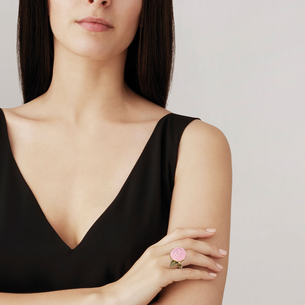 Le motif pivoine perpétue le répertoire floral inspiré par les nombreuses créations florales de René Lalique. Entre rouge éclatant et rose dragée, Lalique décline la pivoine dans son emblématique cristal et joue l’impertinence des détails dans un esprit romantique aux accents rock.