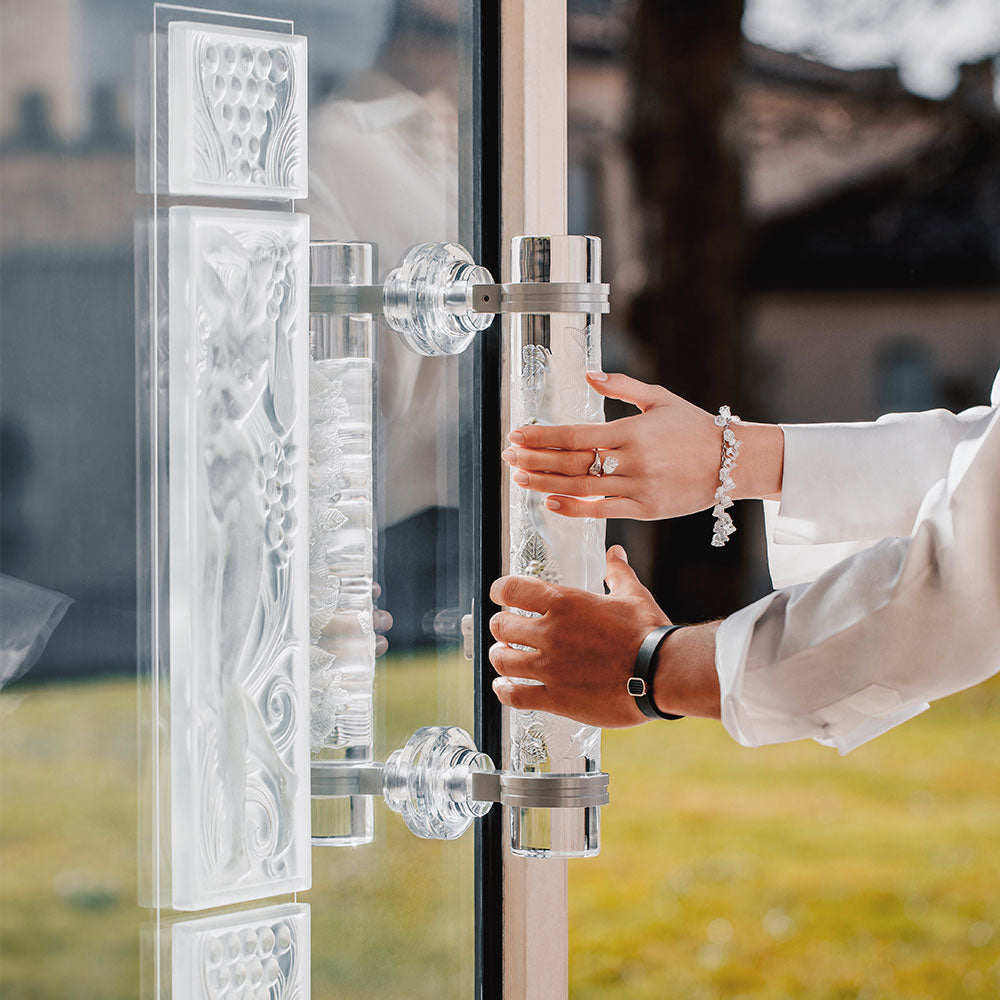 Nommée L’Homme Alpha, cette collection masculine joue des lignes d’un motif de stries. Un incontournable qui sculpte la lumière pour révéler le célèbre cristal Lalique d’un noir énigmatique.
