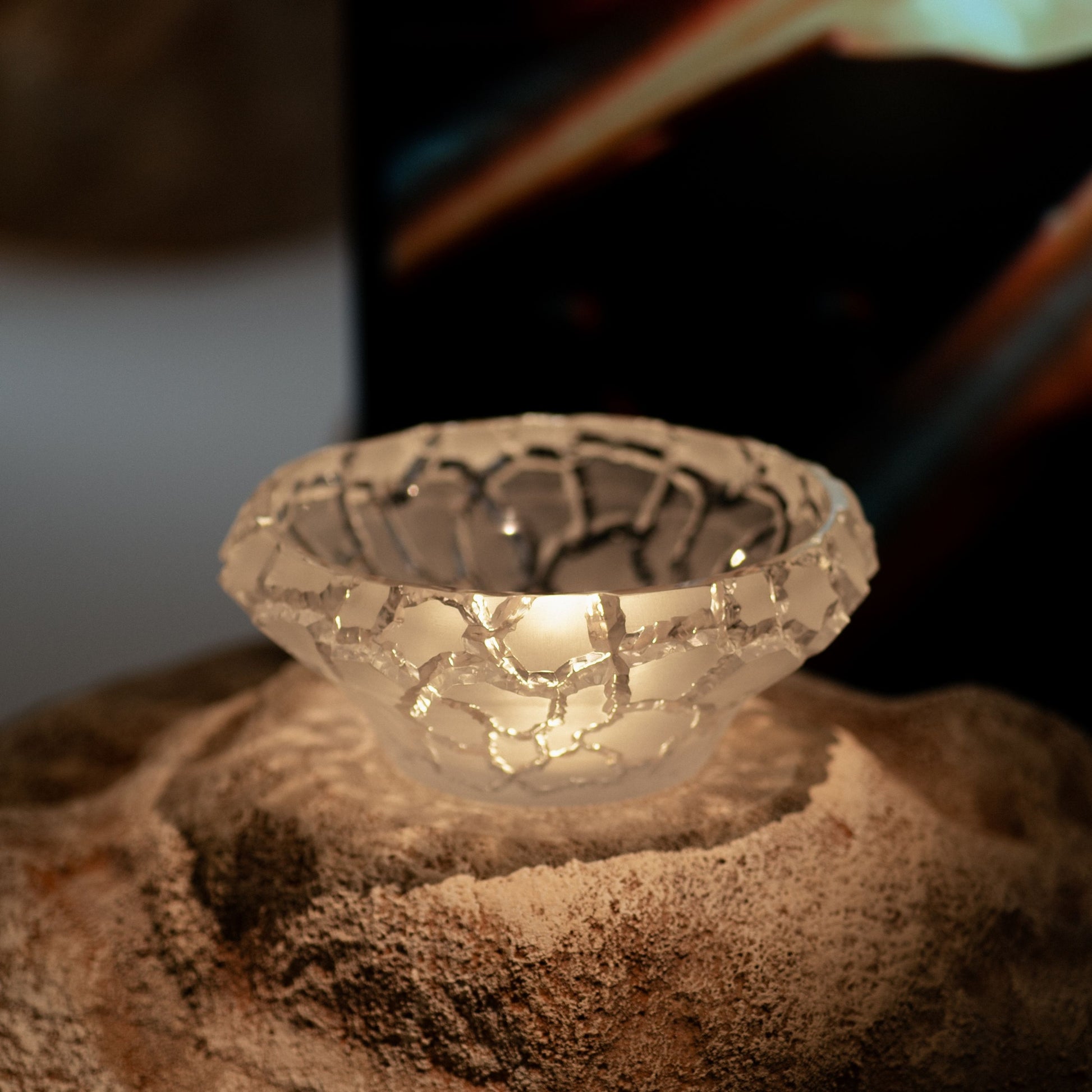 La caldera, grandiose formation terrestre, est le témoin d’une histoire volcanique. Par sa forme circulaire, ce vaste cratère devient réserve de beauté et gardien de secrets millénaires. Les pièces Caldera en prennent les contours, sous un délicat motif de craquelures évoquant le perpétuel renouveau de la terre. Entre ombre et lumière, le contraste du décor est sublimé par le cristal satiné repoli, signature de Lalique, qui apporte une esthétique un réalisme singuliers. Inspiré par ce majestueux réceptacle de la Nature, Lalique le cristallise en coupe. Un hommage à une Terre minérale qui nous offre un spectacle éternellement poétique.