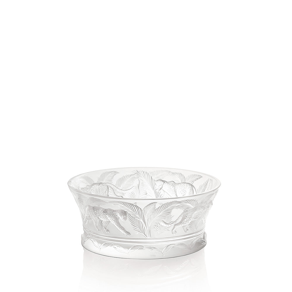 Agile et sensuel, symbole de pouvoir, le jaguar prend vie dans la pureté du cristal satiné de la coupe Jungle. Sa silhouette élancée laisse apparaître ses muscles puissants, recouverts d’une fourrure de cristal aux mille taches sculptées. Avançant à pas feutrés parmi une végétation luxuriante, il présente la force et la grâce propres aux félins et aux grands prédateurs.